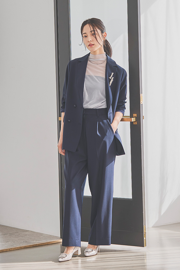 ジオメトリック風なアシンメトリーバックルで、足元にさりげない個性を。ネイビーのスーツスタイルに、クールなライトグレーが抜けをつくり、今っぽく更新してくれます。