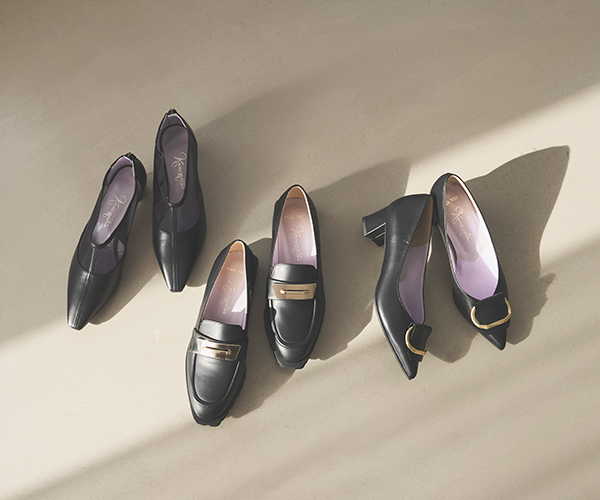 透け感のあるシューティや、立体的なプレートモチーフのローファー、アシンメトリーなバックルパンプスまで幅広くラインナップ。脱いだときに覗く春色の中敷きが、さりげなく気分を上げてくれます。