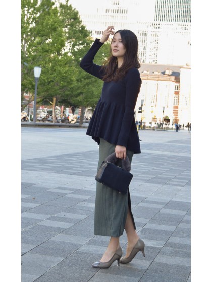 細身の木型を使用したコンビネーションパンプス。質感の異なる3種類の素材をトーンオントーンで組み合わせたさり気ないミックス感を楽しめます。<SLENDER/AQUA BELL>