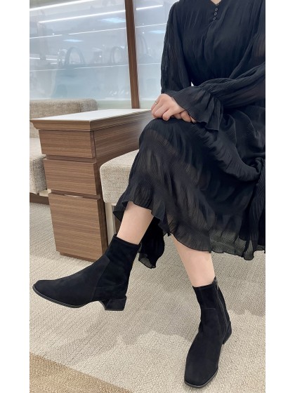 ゆったりめの木型を使用したスクエアトゥのストレッチショートブーツ。