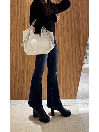 スタッズ付きの長い手紐を上にして肩掛けもできる2Way仕様です。