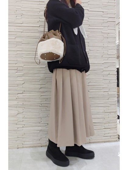 サスティナブル背景の素材をトレンド感ある巾着デザインで表現し、フェイクファーで季節感を高めたハンドバッグ。