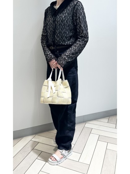 リボンを編み込んだデザインが可愛いハンドバッグ。