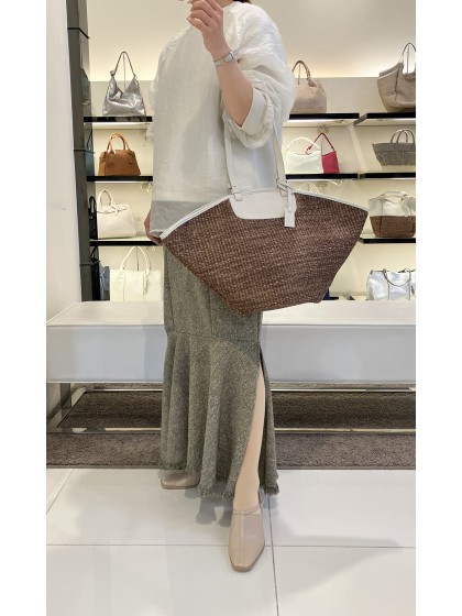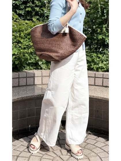 ラフィア素材を編み込んだ、扇型ハンドバッグ。
