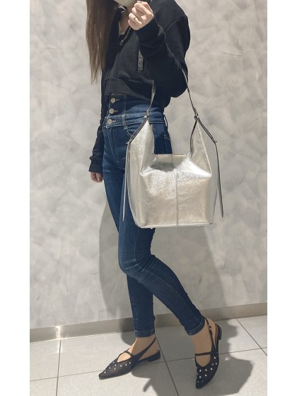 口元から大きくカーブし底に向かってすぼまったアウトラインのデザインが特徴的なホーボーバッグ。