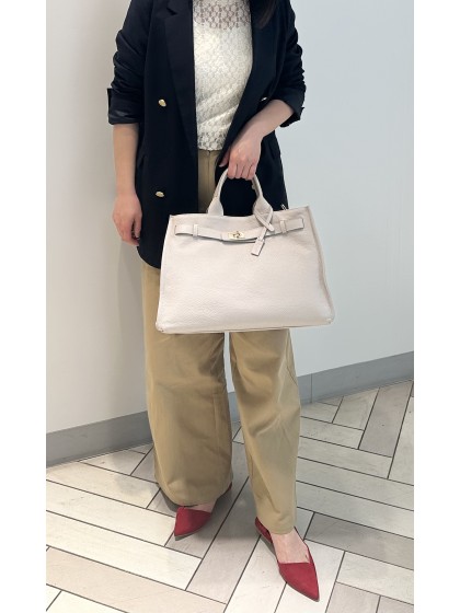 トレンドのターンロックベルトデザインが目を引く大容量サイズのハンドバッグ。