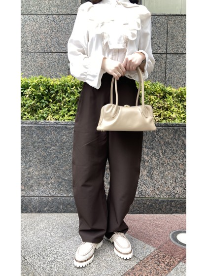 トレンドの横長×ロングハンドルのフォルムをややカーヴィなラインと大きく入れたダーツで立体的にこなしたボストンバッグ。