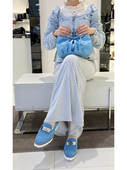 コロンとカワイイ形とギャザーの陰影にメタルリングの引き締めが加わり、キャッチーなバッグに仕上がりました。サイドのホックをはずしてマチを広げると横長バッグに◎